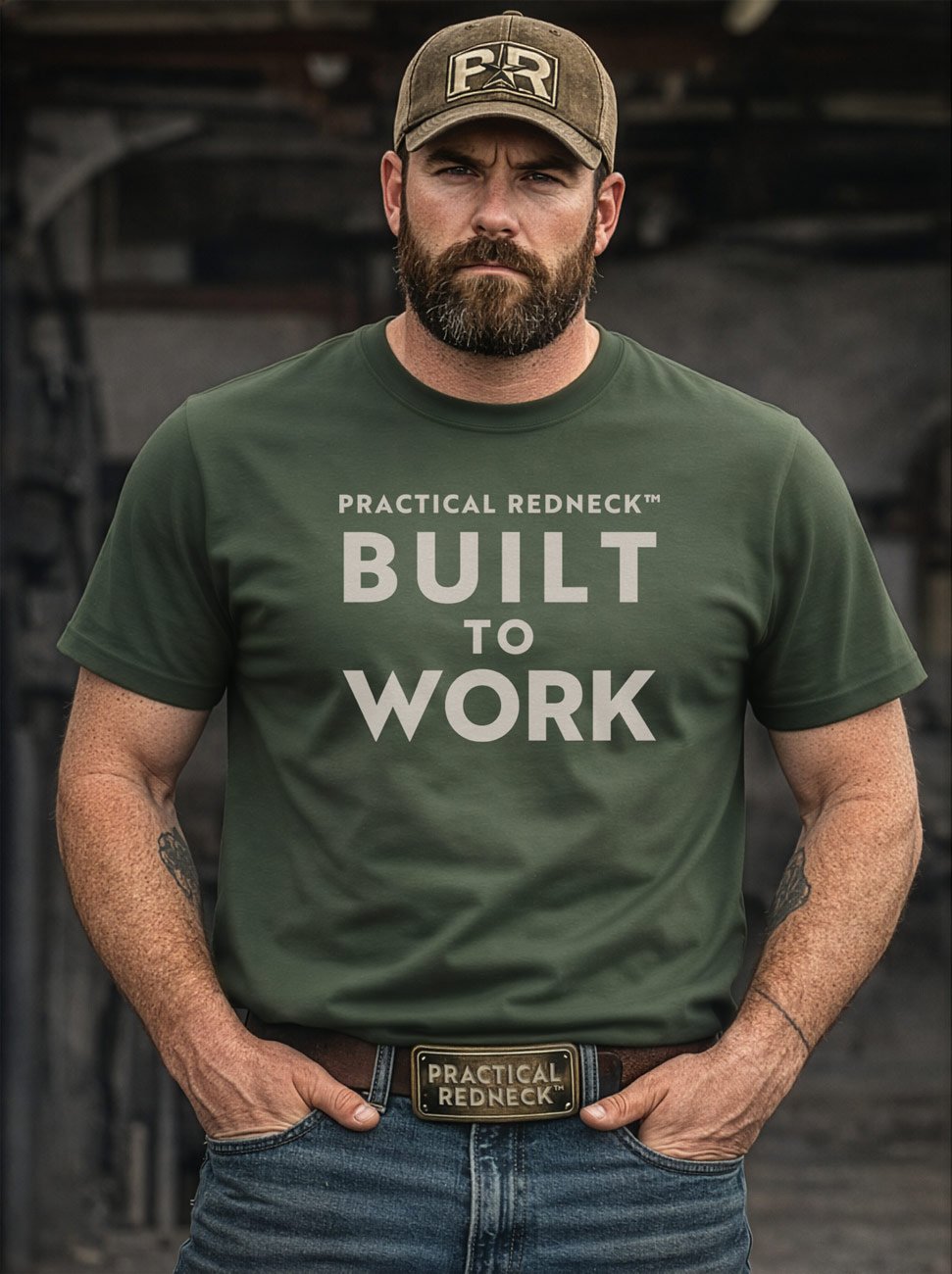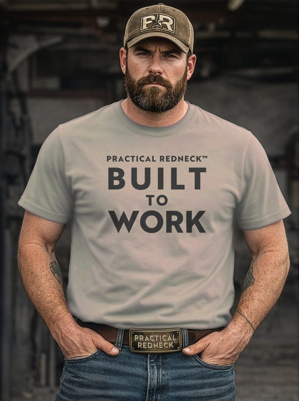 The Built To Work shirt represents the Practical Redneck™ mindset — dependable, capable, and ready for real-world work. Clean, bold, and workwear-driven, this design is made for the shop, the farm, the garage, and anywhere else the job needs done. No gimmicks. No fluff. Just solid gear built for everyday wear.